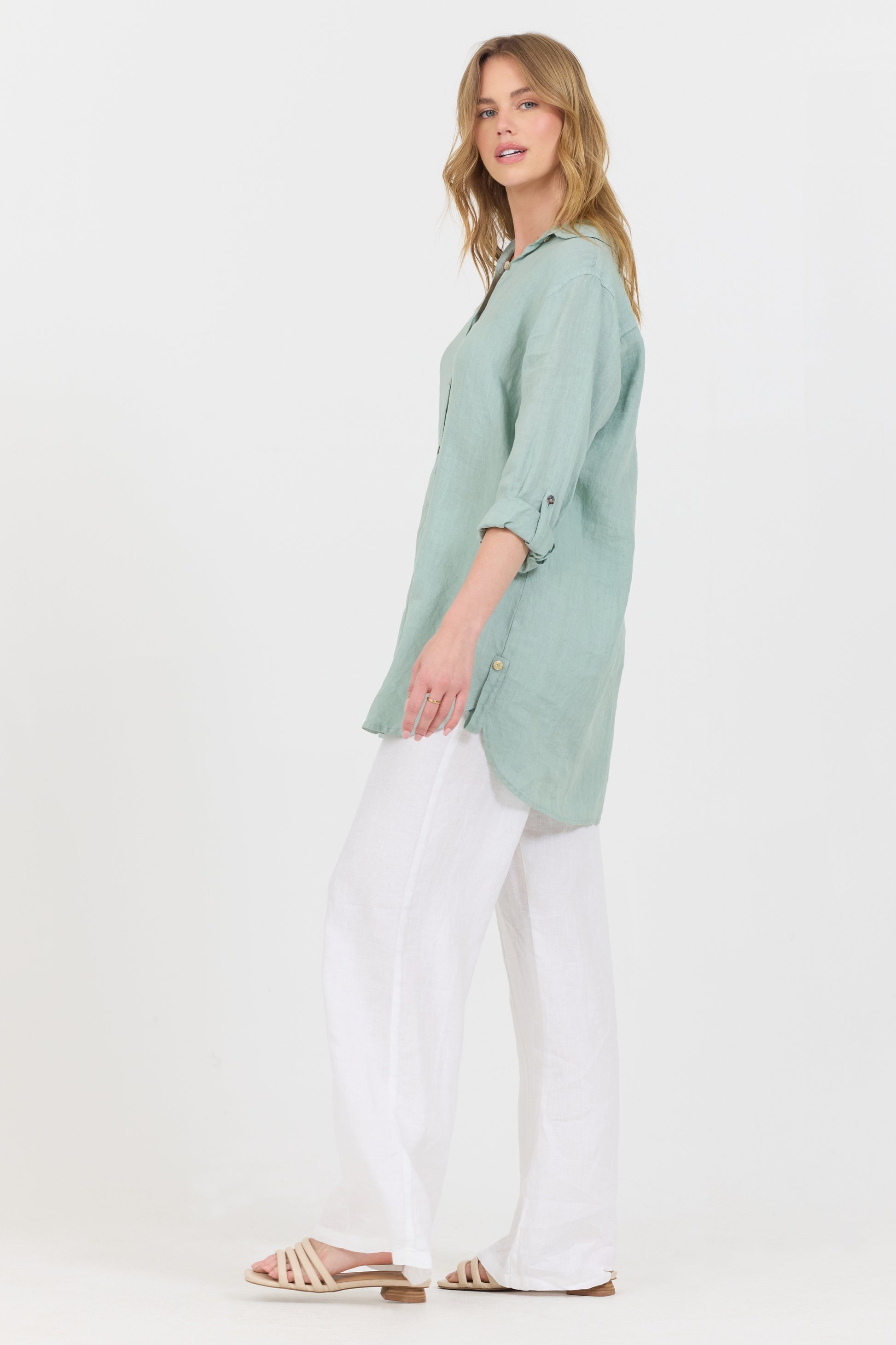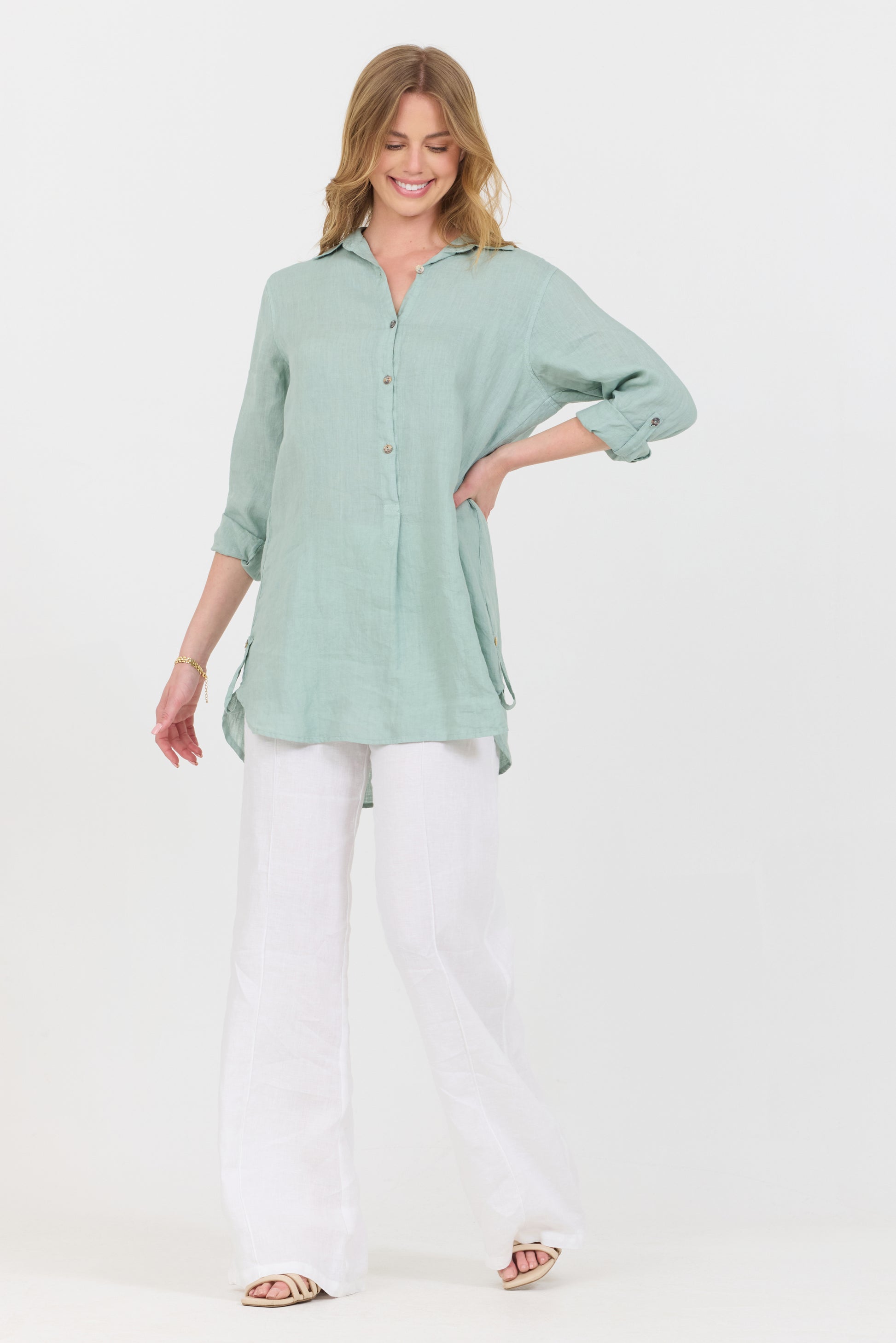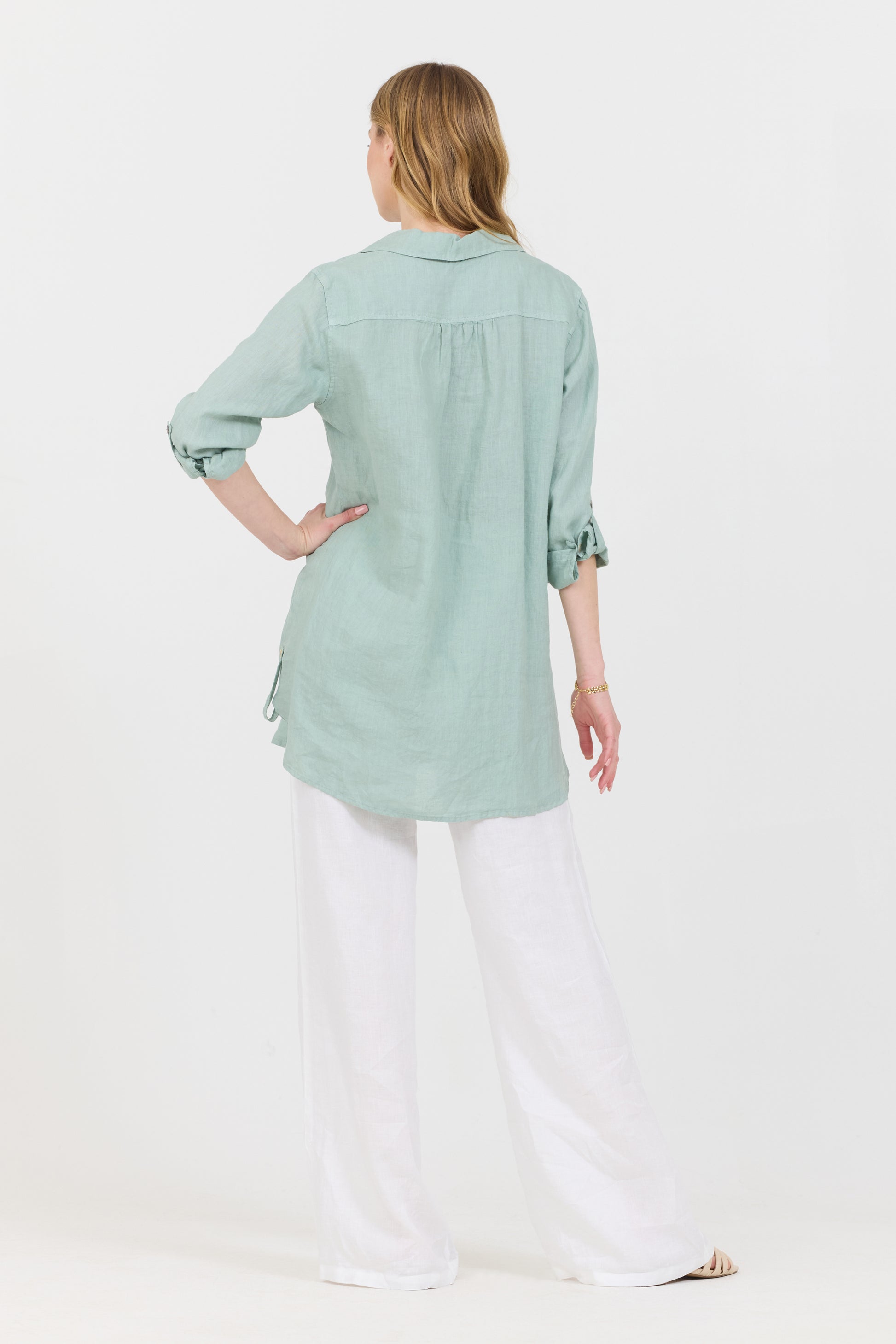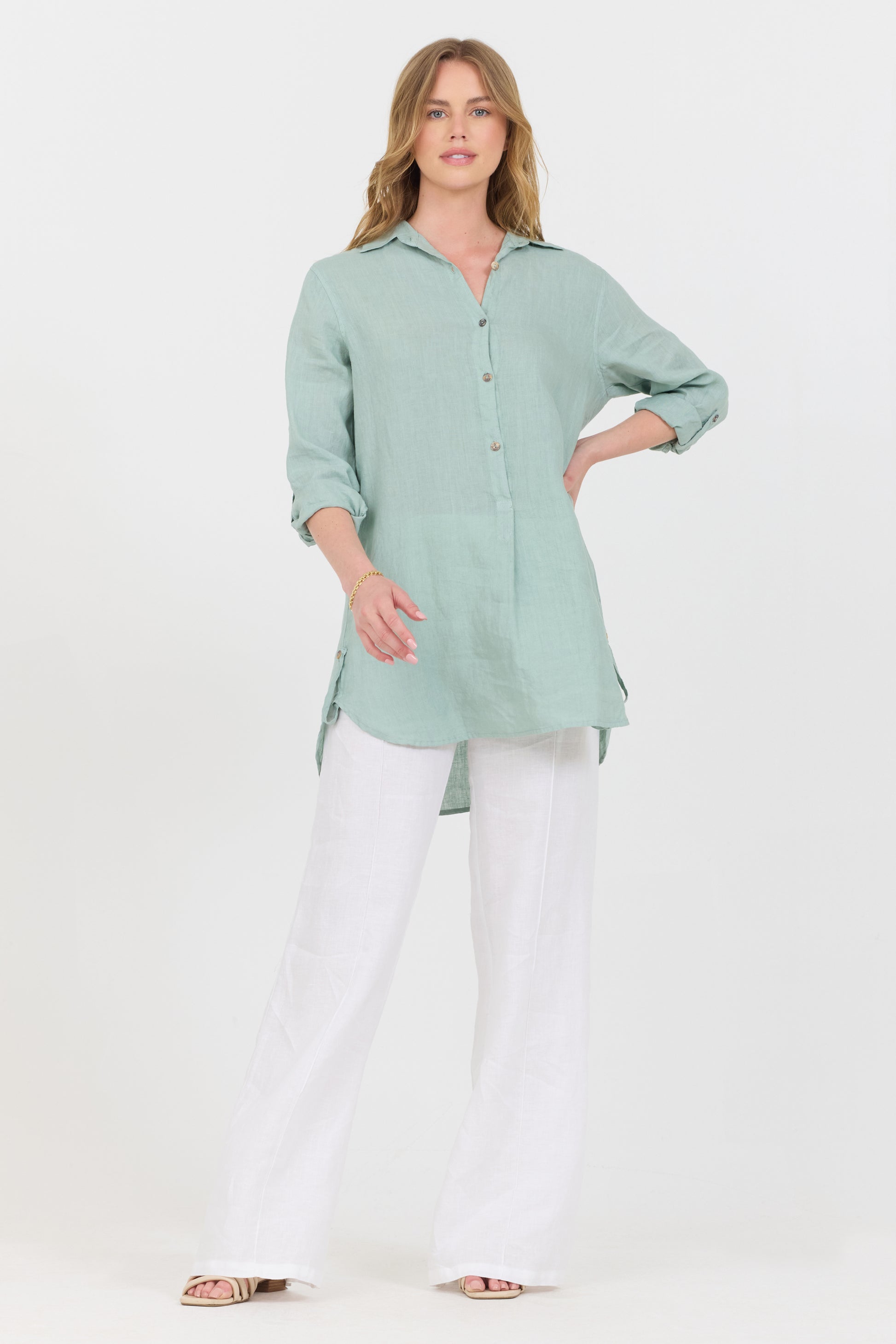 A stylish linen ¾ button down shirt featuring rolled sleeves finish for the most flattering look.