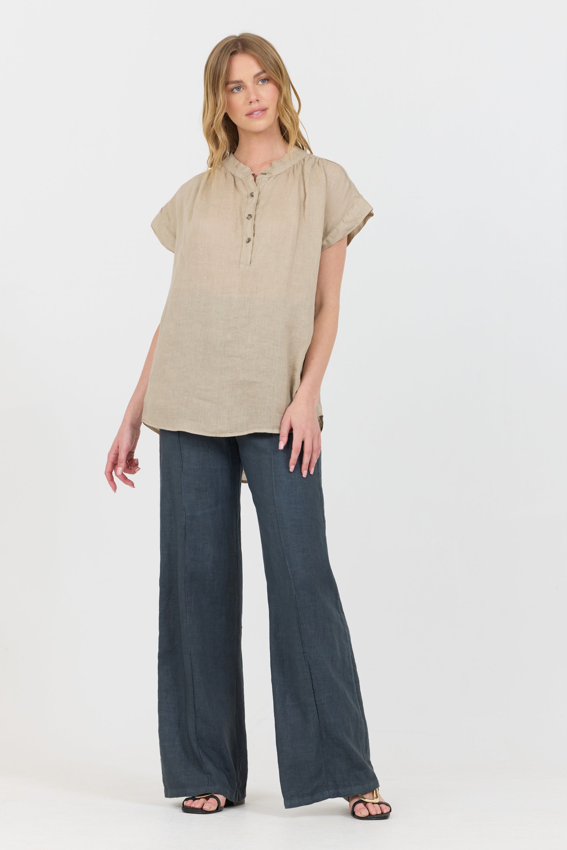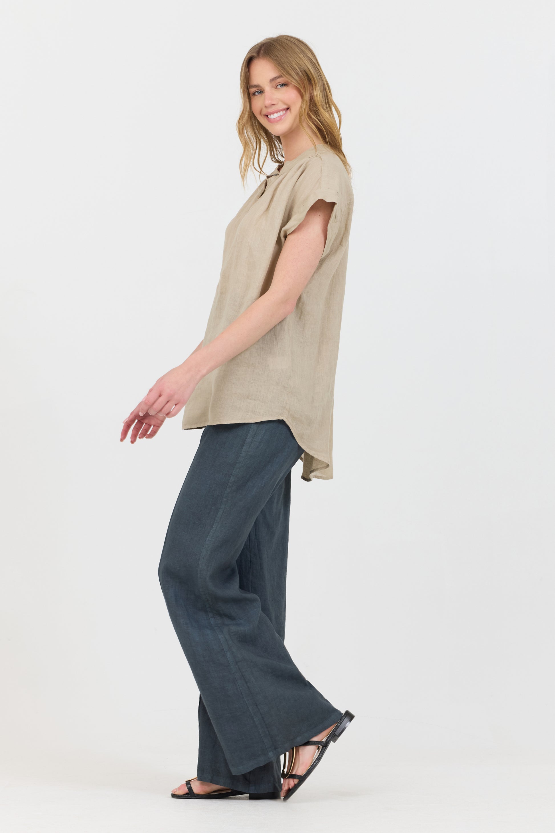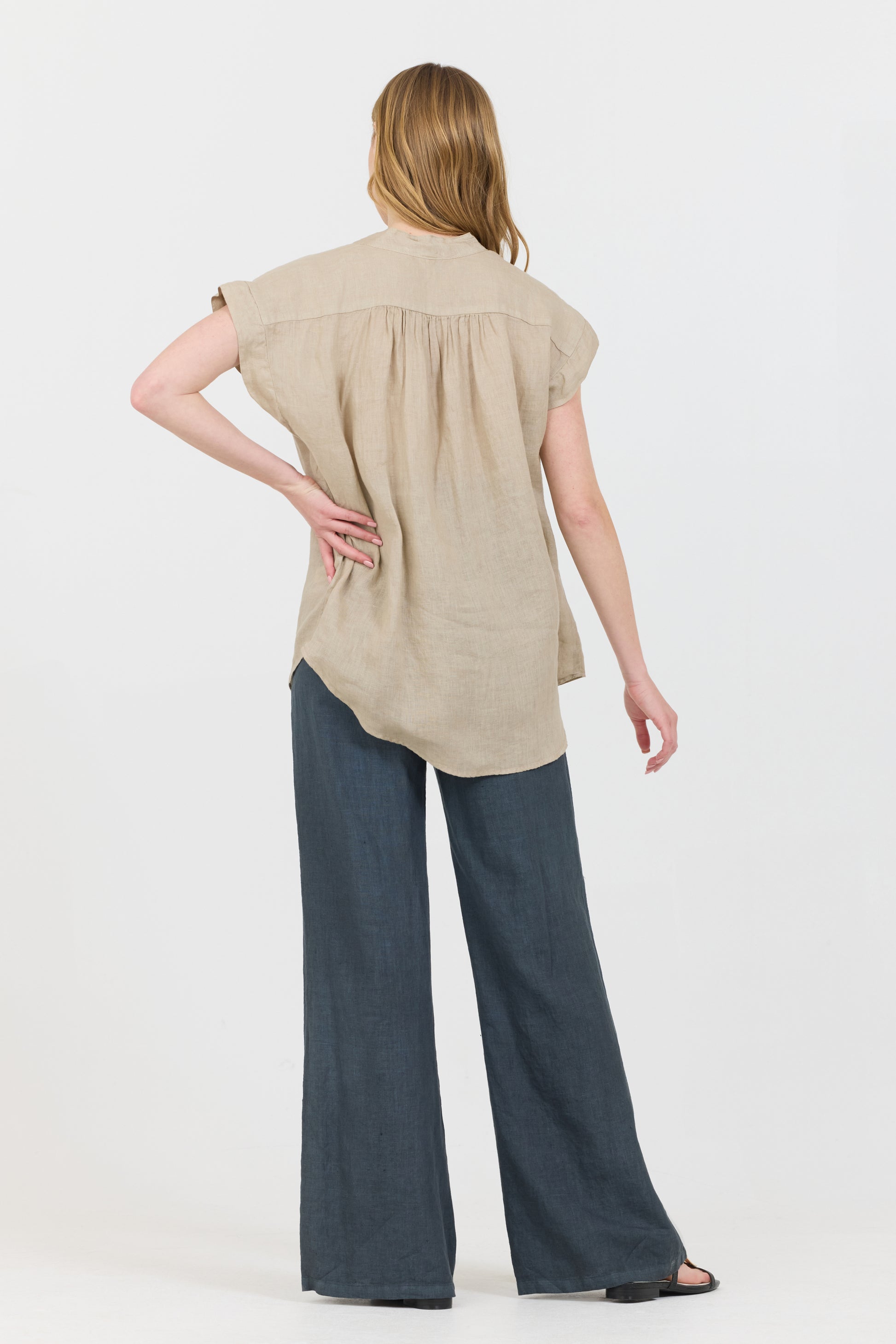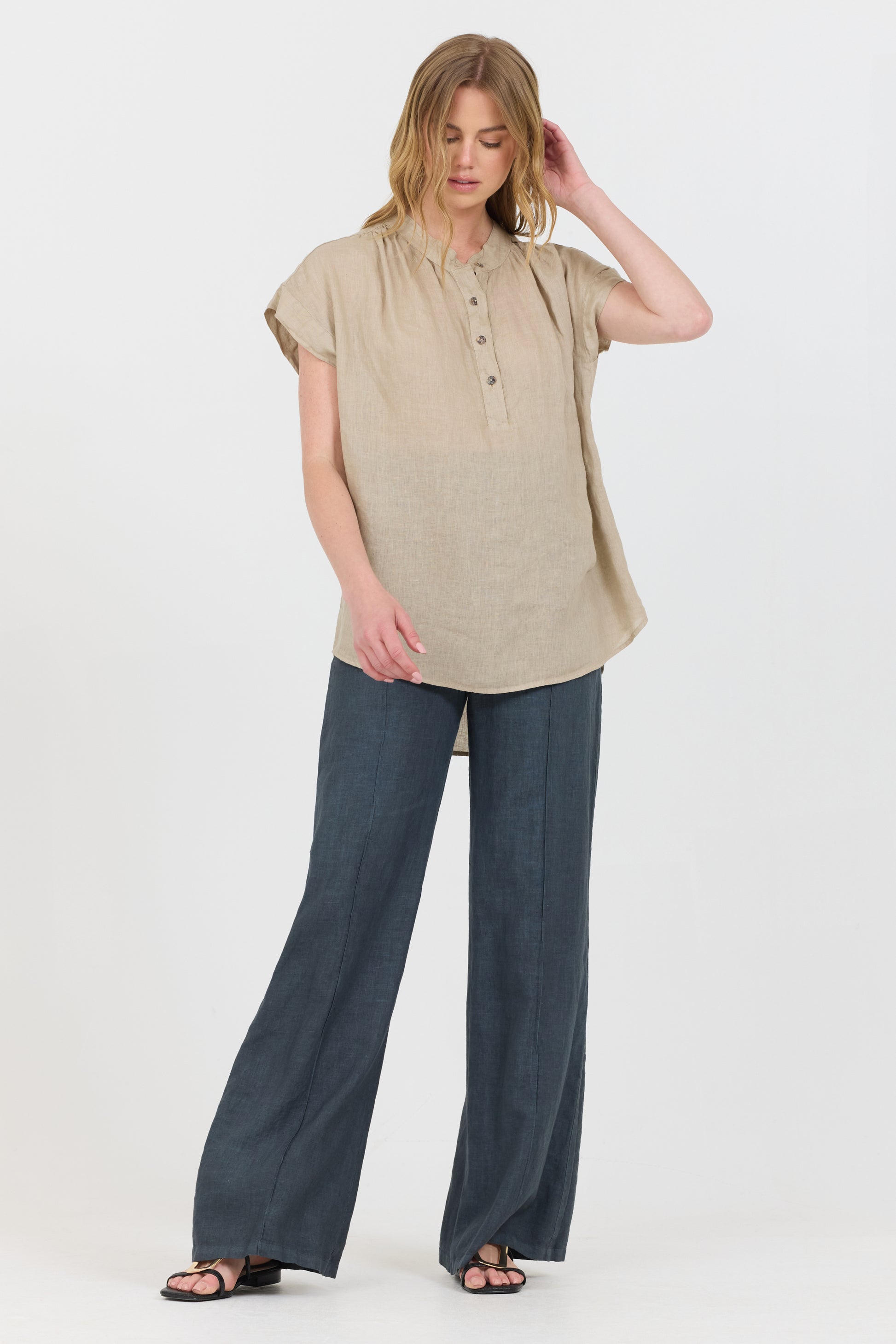 Linen button up featuring raw edge ruffle collar, an alternative to the classic 3 button shirt, this piece has a lovely shade perfect for Spring.