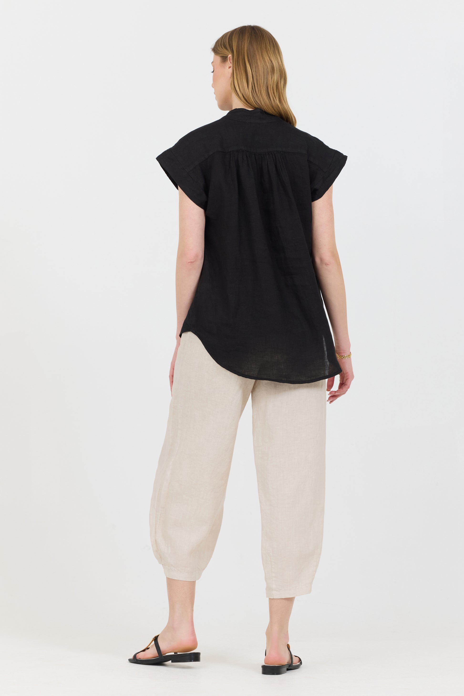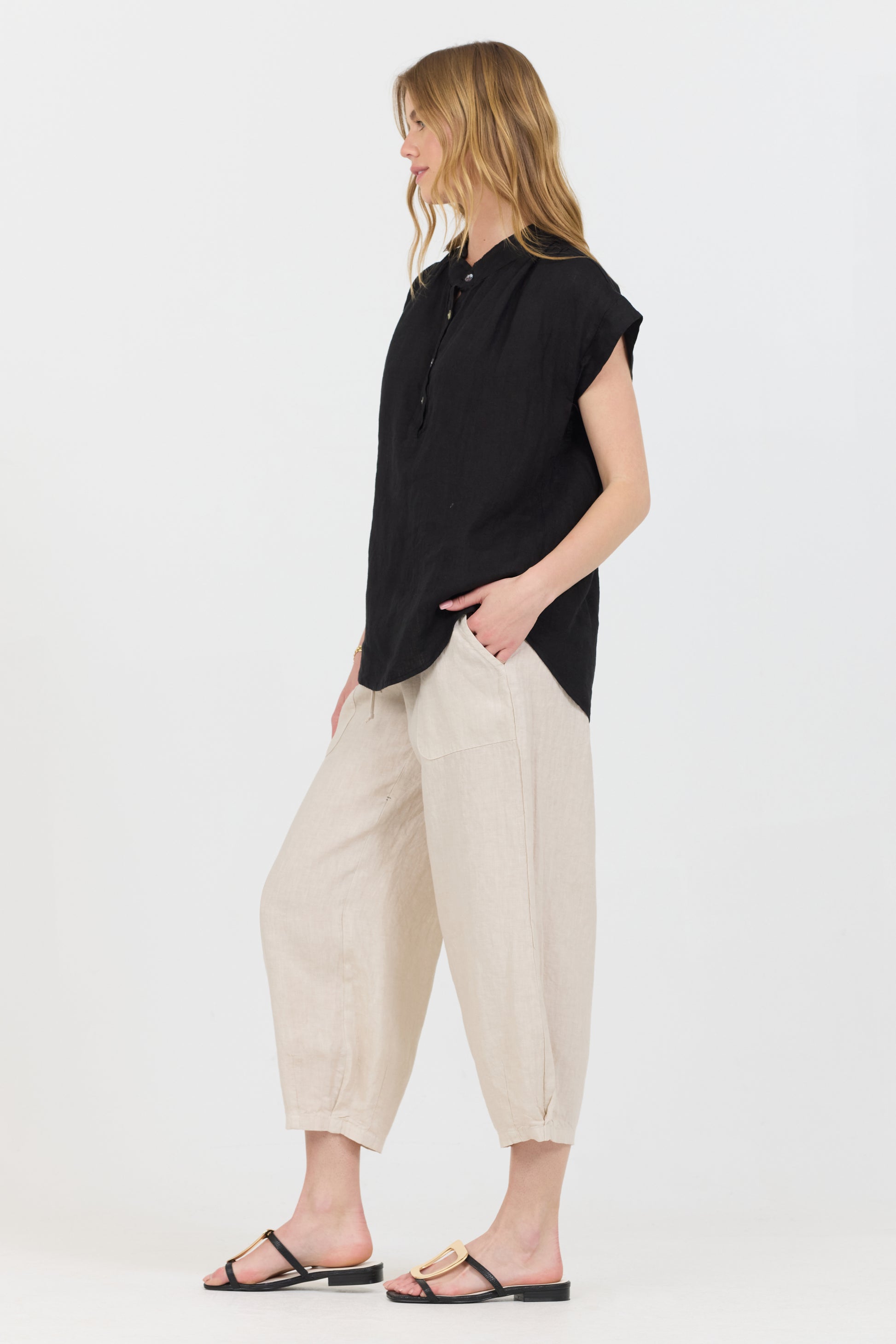 Linen button up featuring raw edge ruffle collar, an alternative to the classic 3 button shirt, this piece has a lovely shade perfect for Spring.