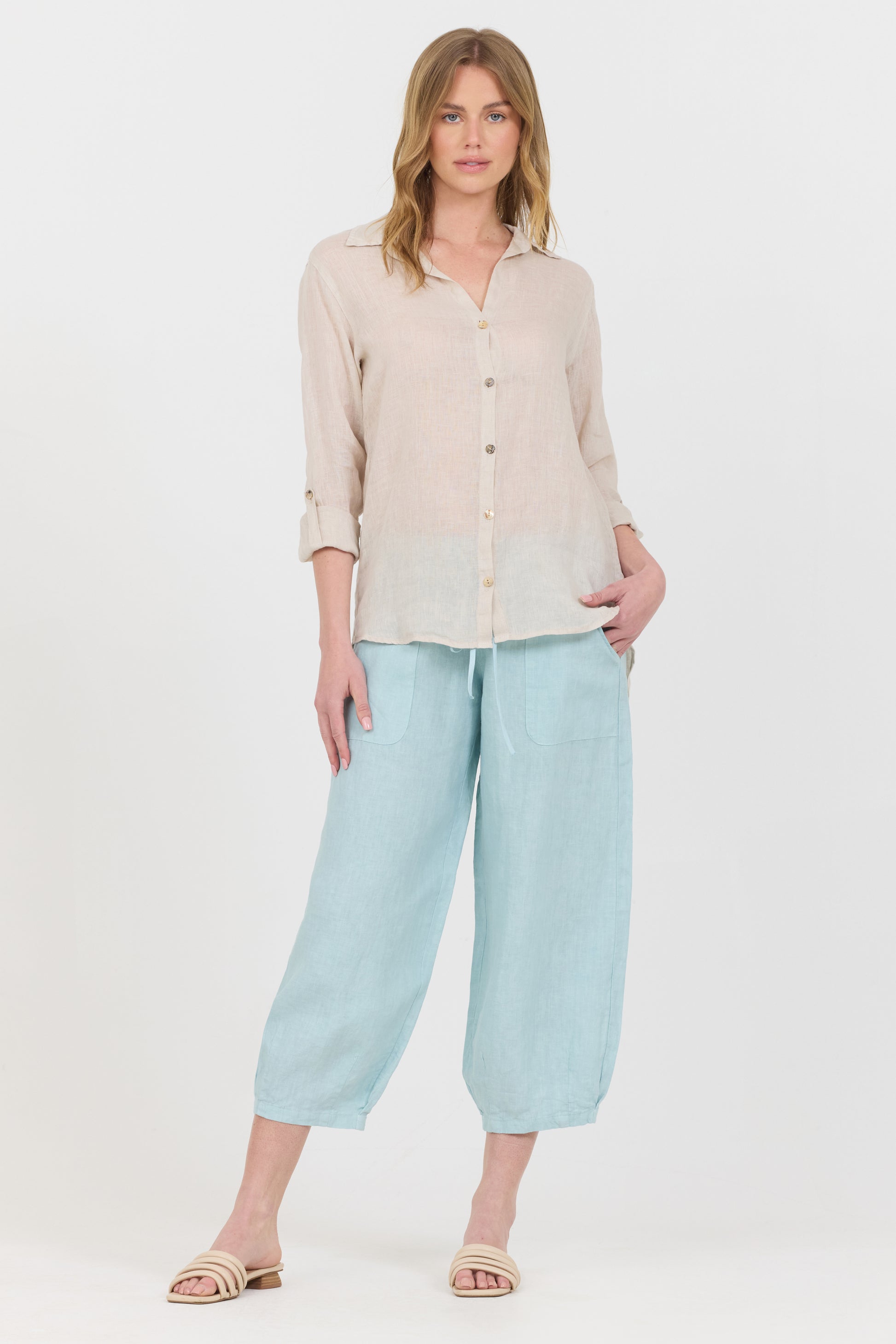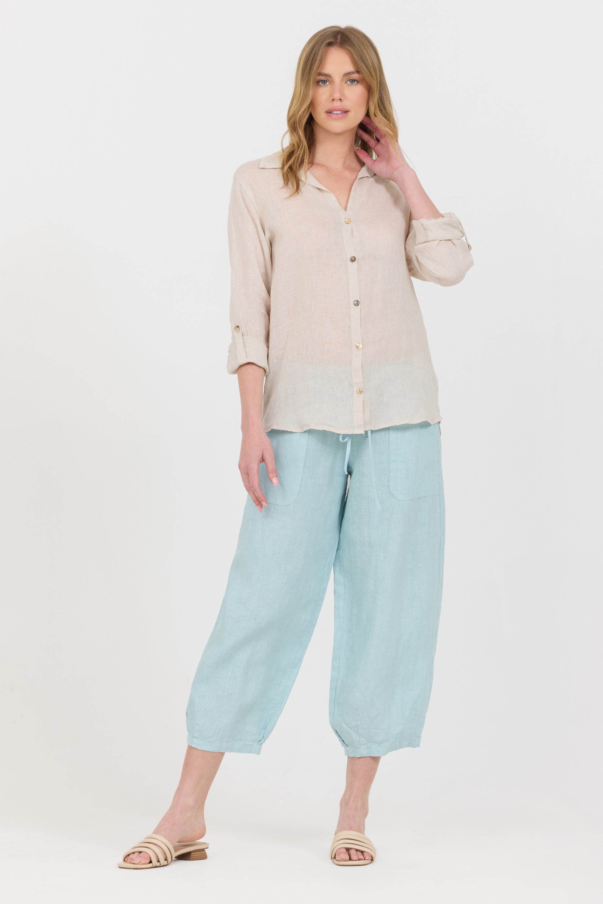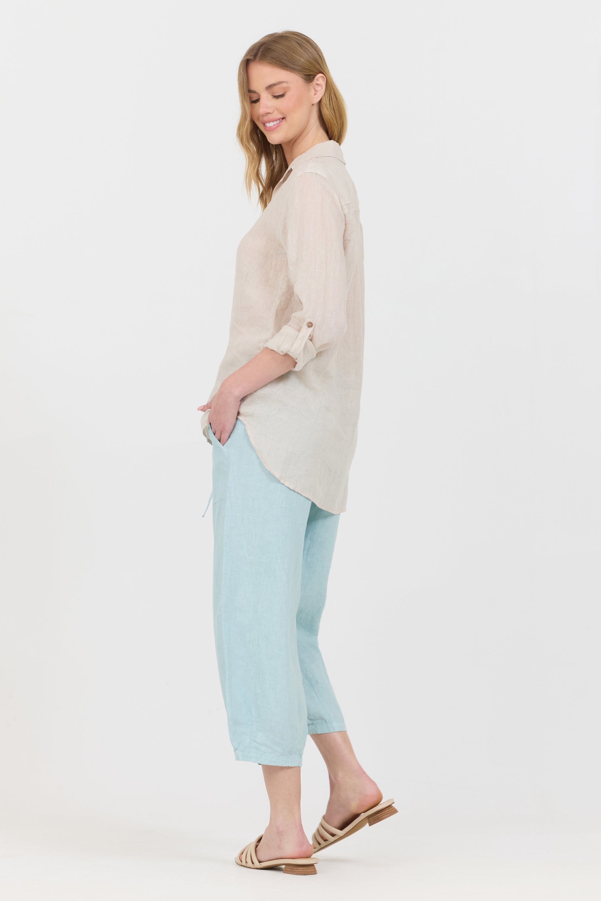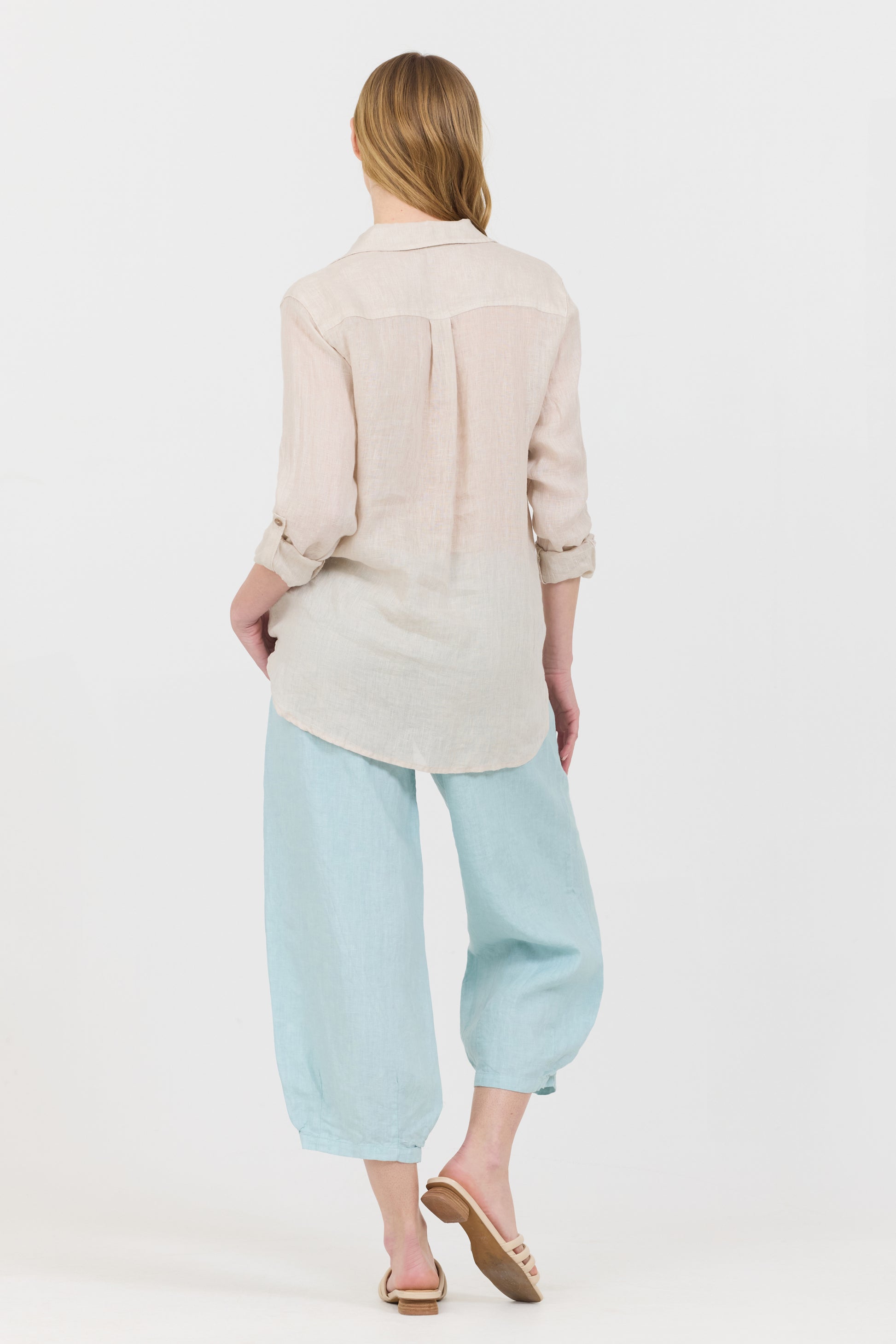 Linen button-up with a twist. Pair with jeans or our classic linen pants to complete a cool and breezy look.
