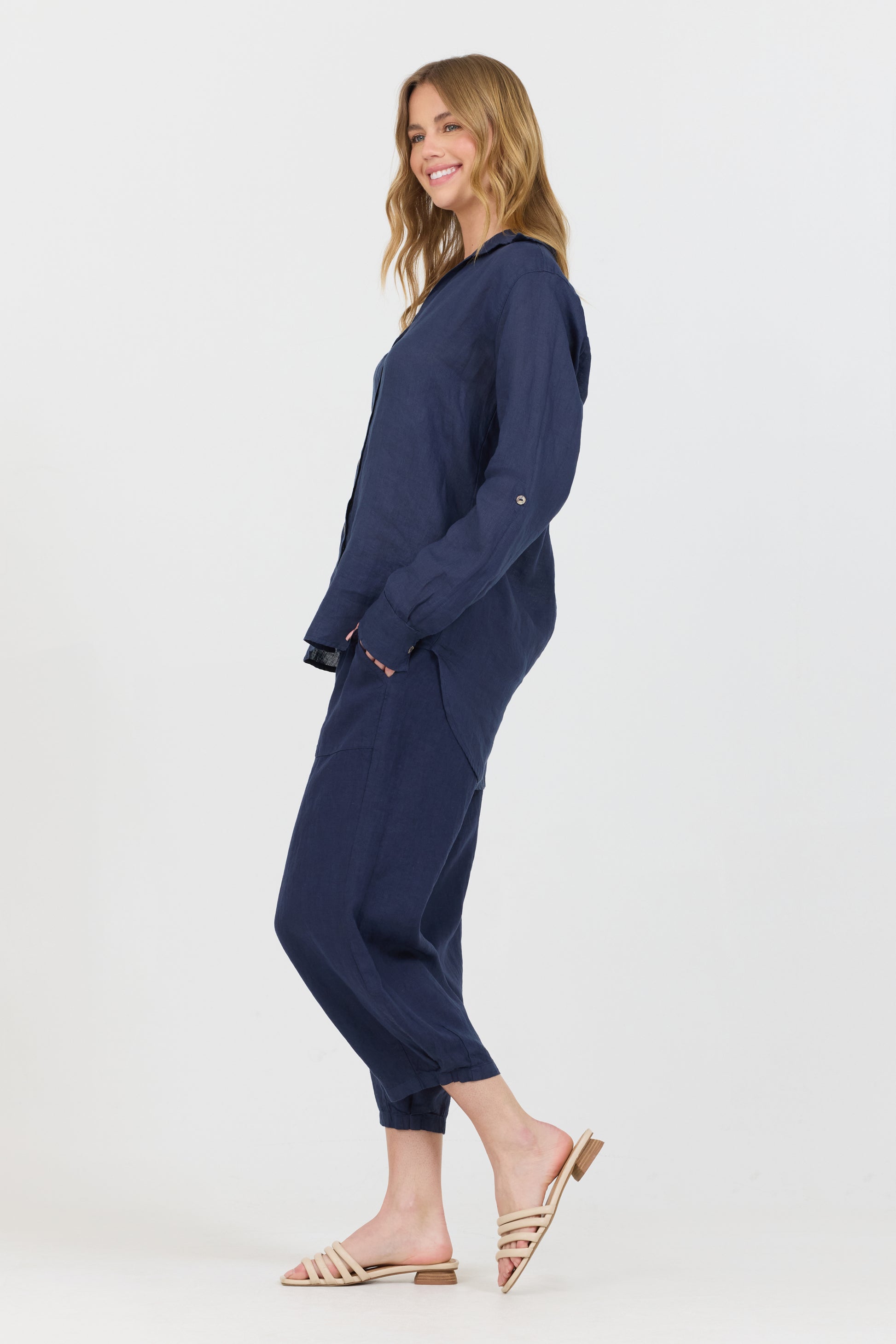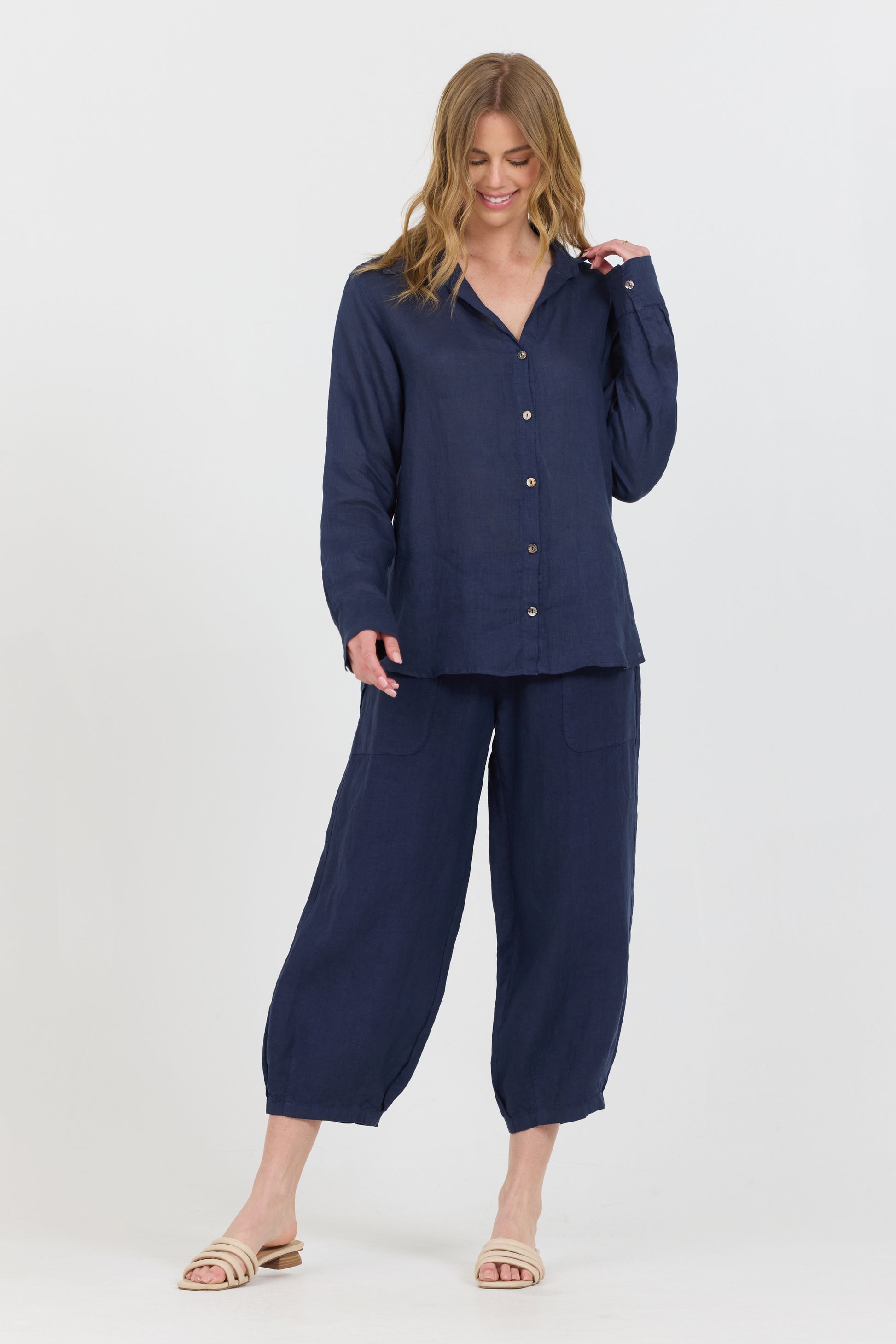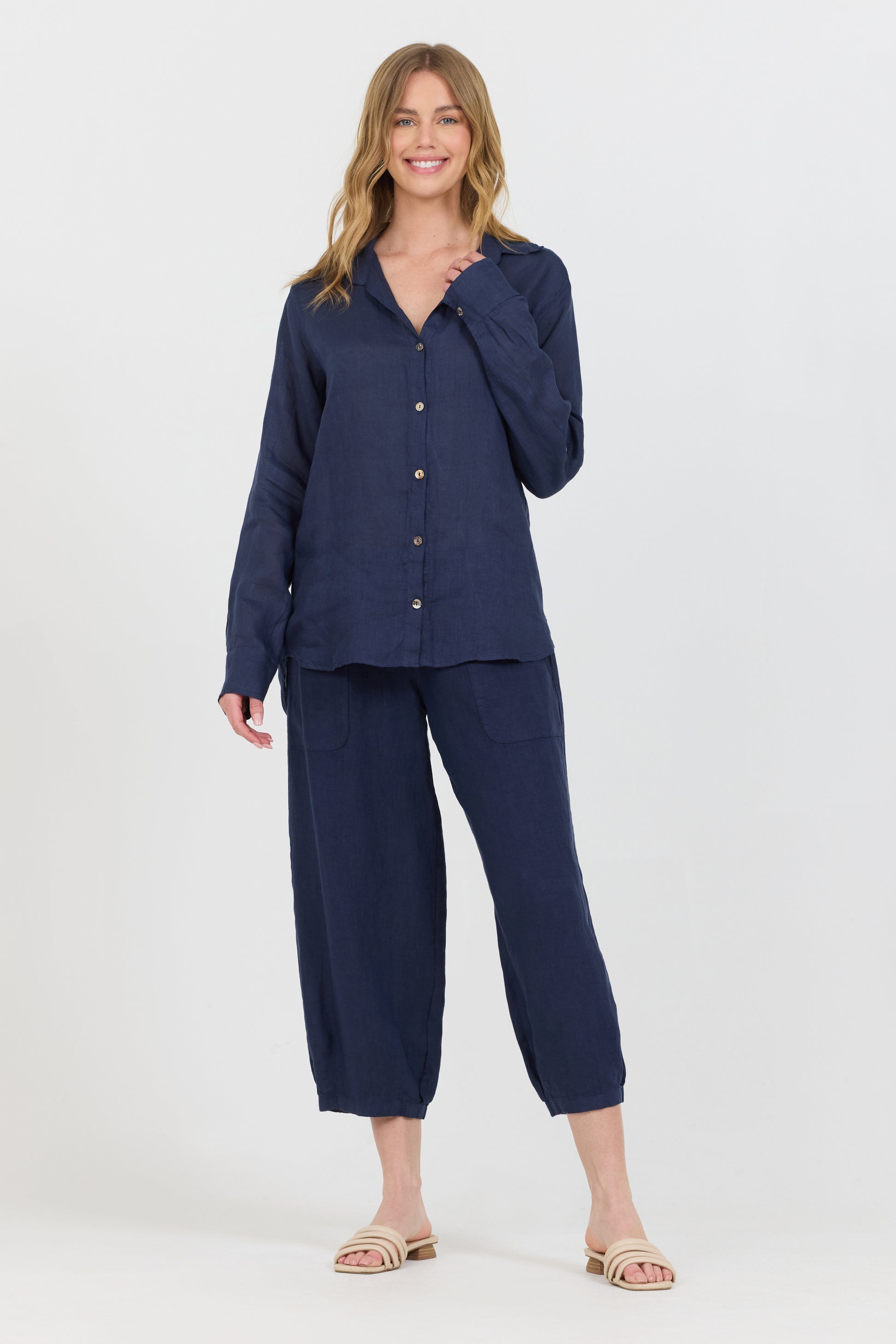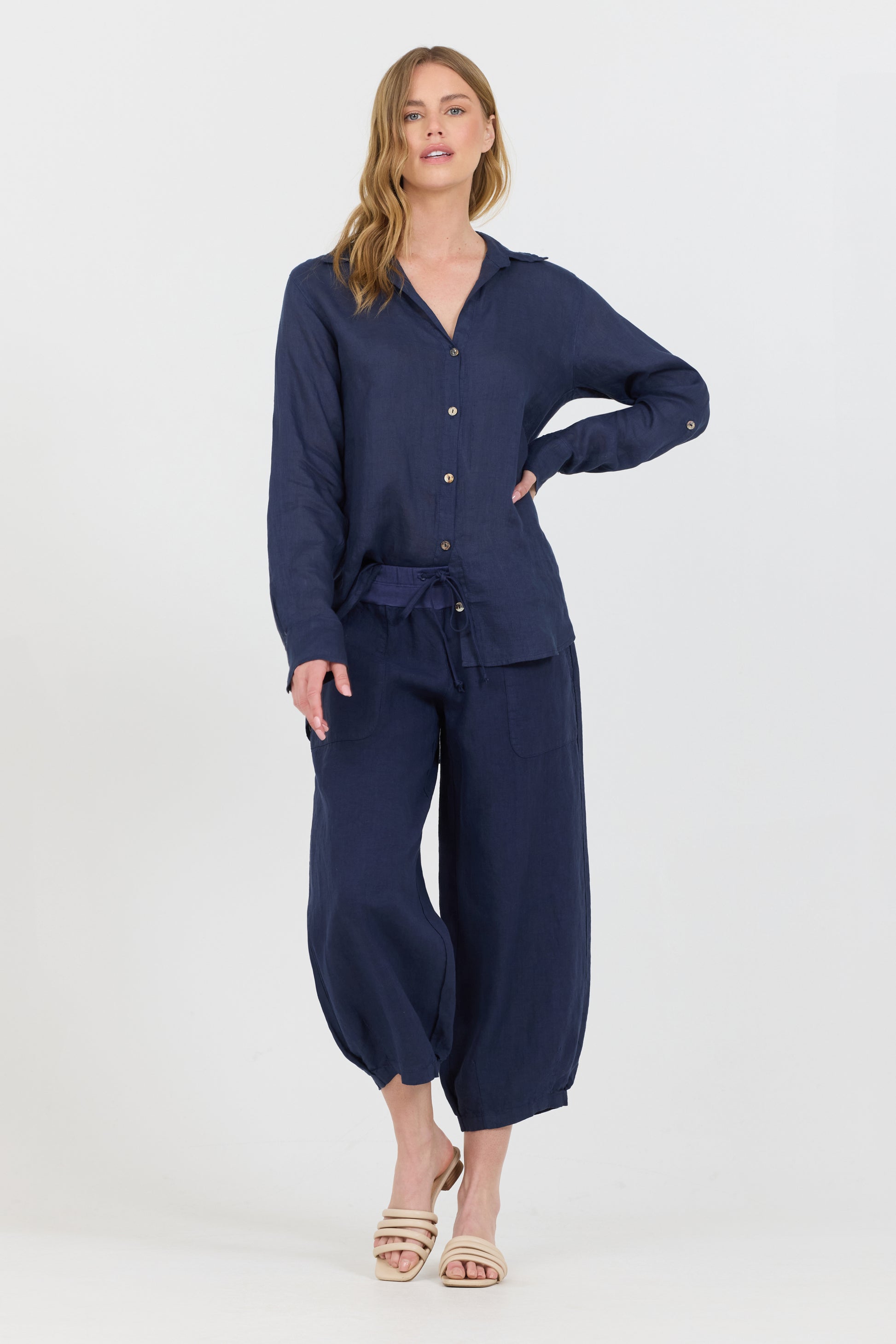 Linen button-up with a twist. Pair with jeans or our classic linen pants to complete a cool and breezy look.