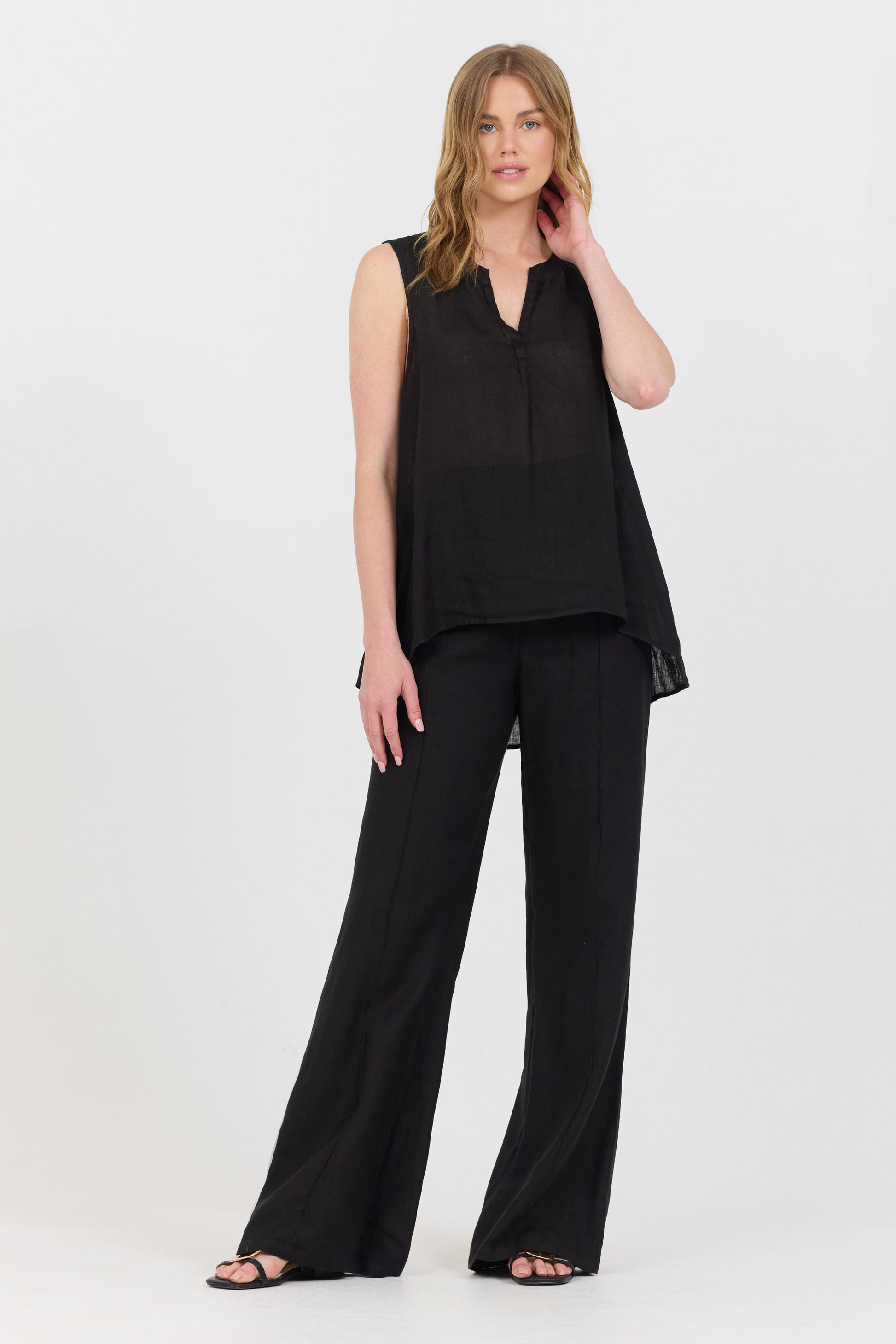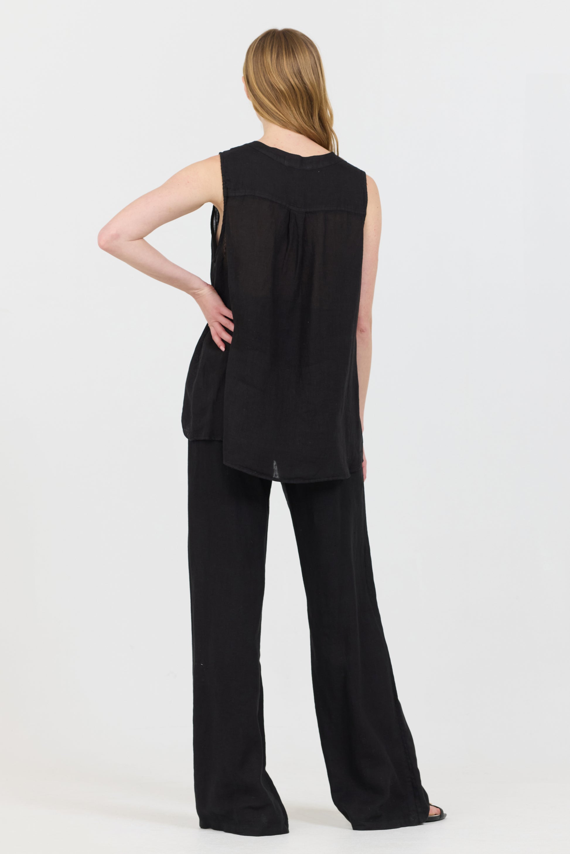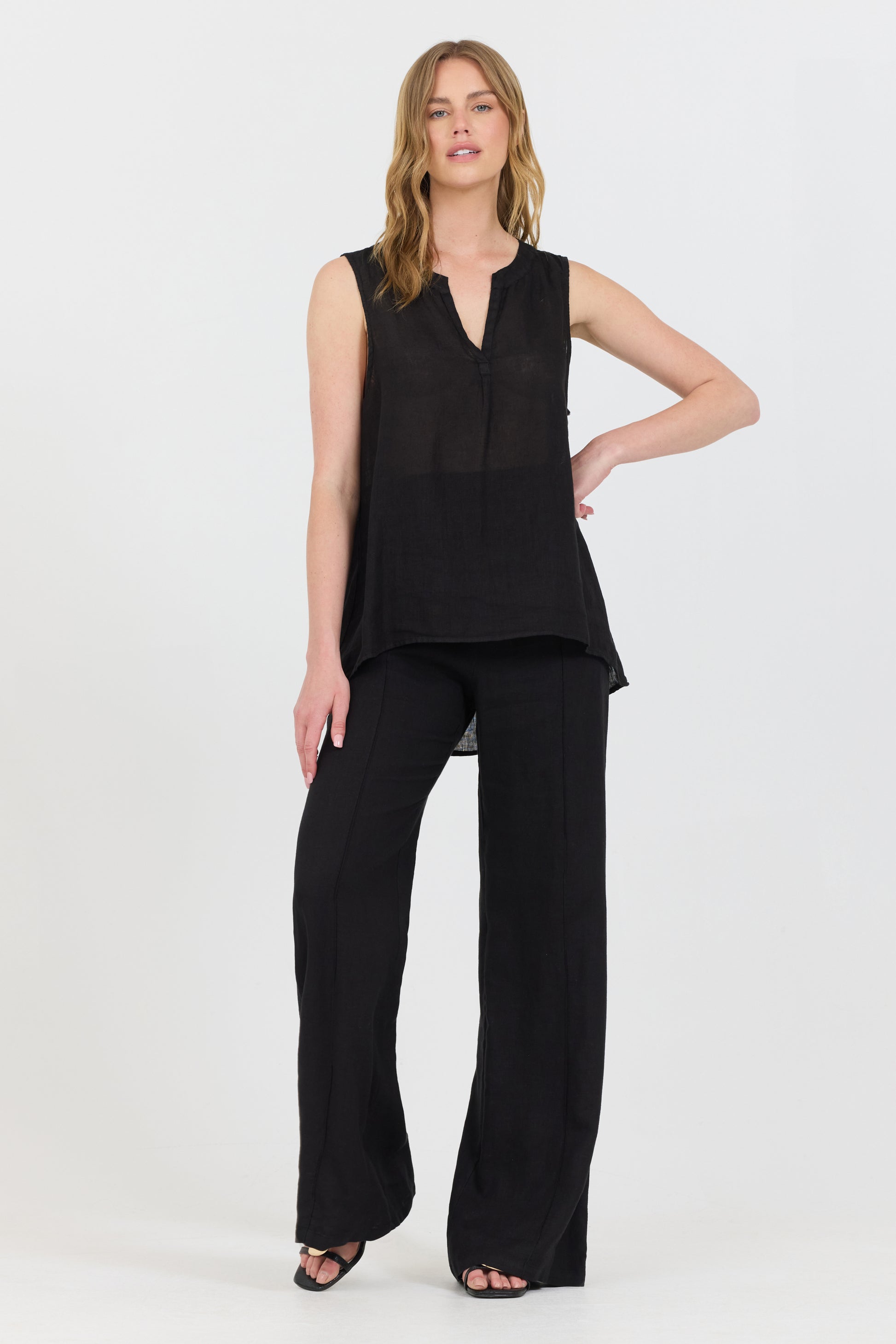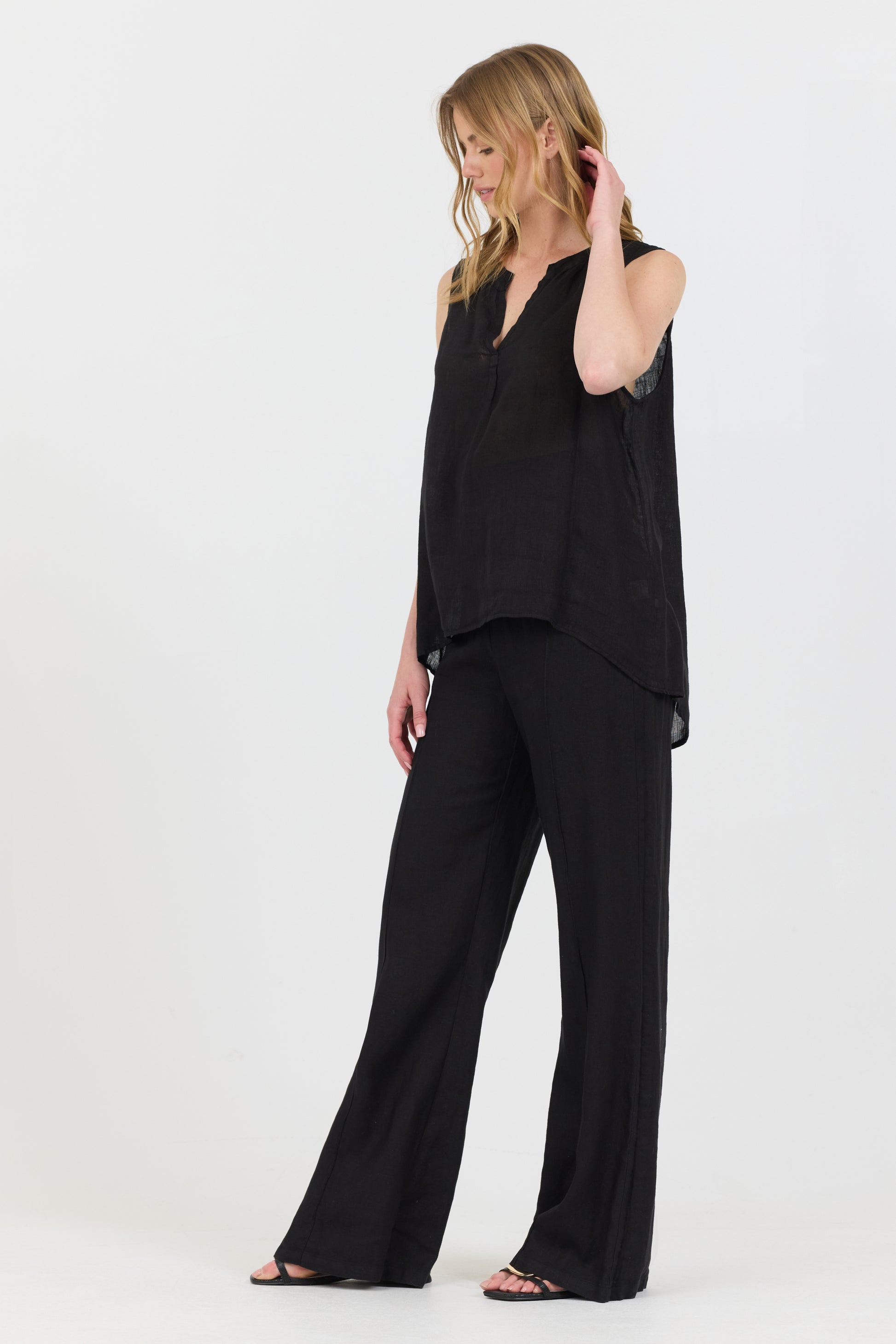 The perfect partner as the weather heats up: this linen v-neck tank with an uneven finish is made in a beautiful Spring hue.