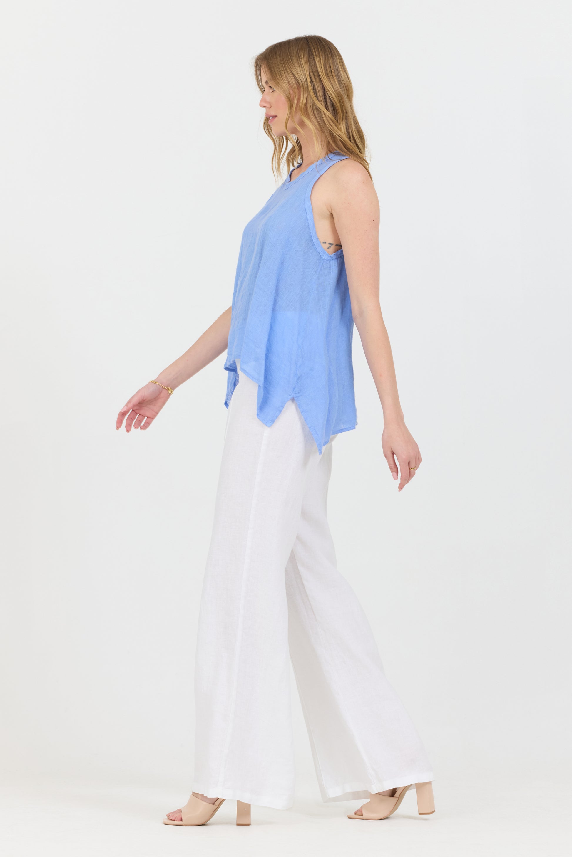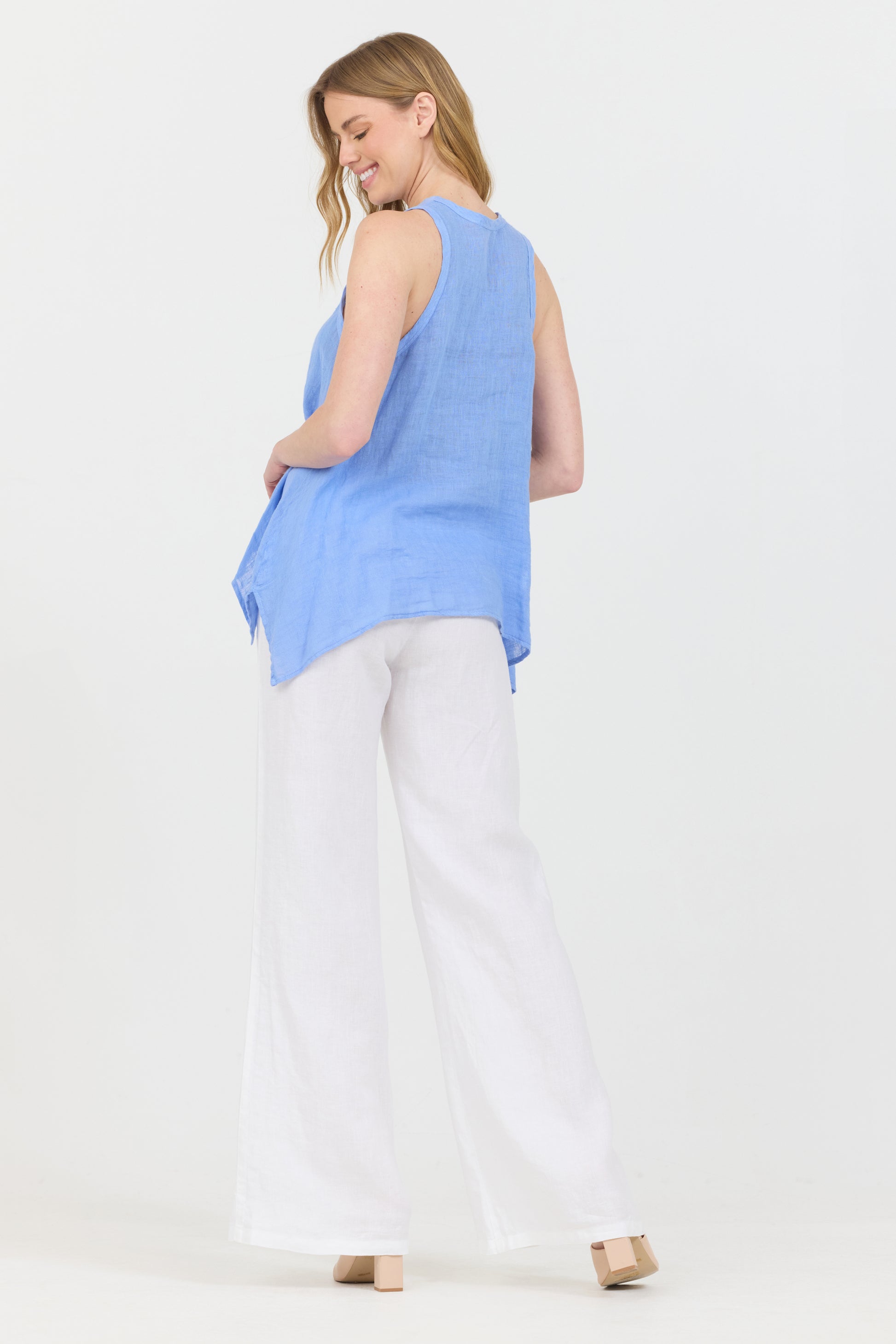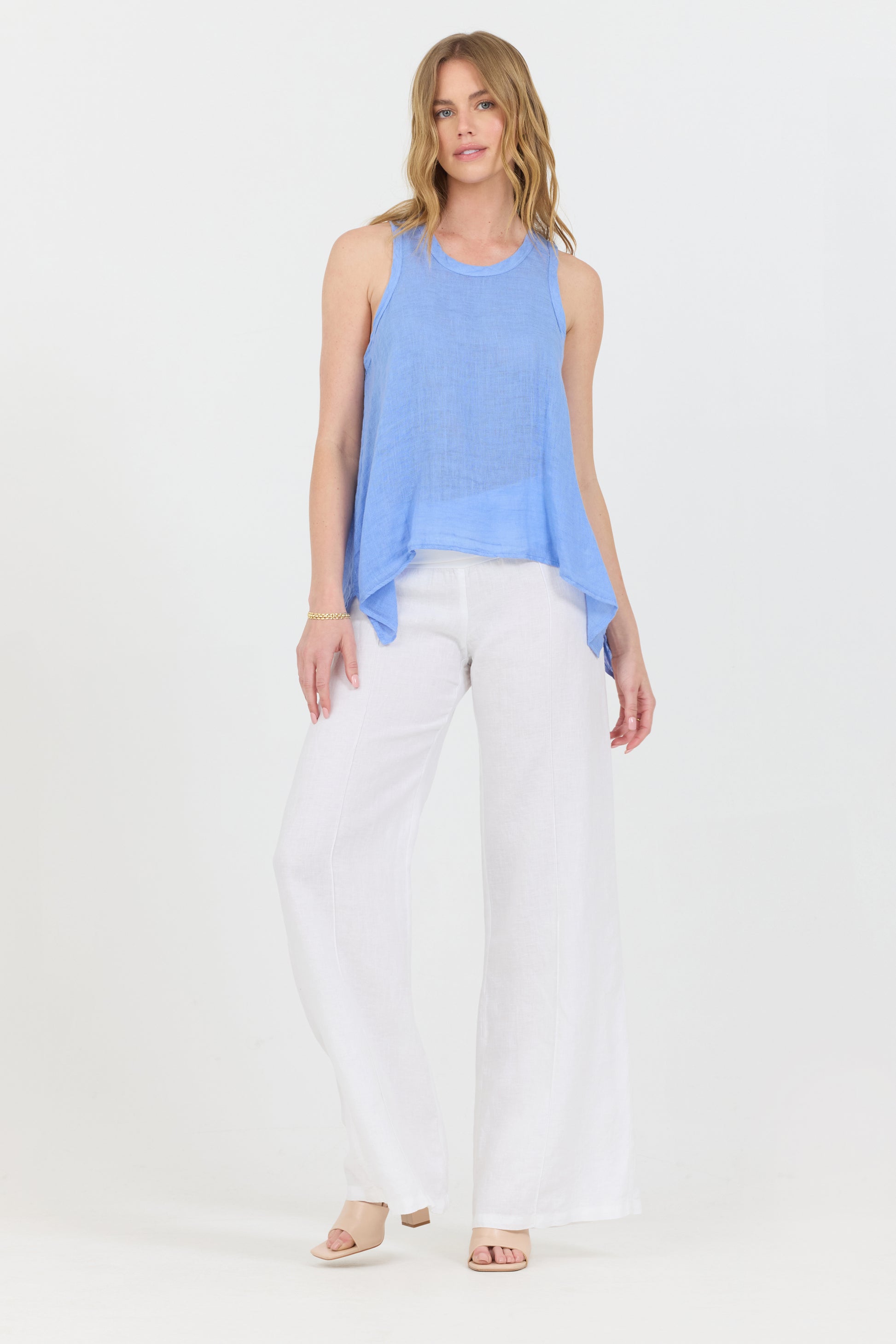 Cool and breezy uneven linen tank top. The uneven lengths on the front and back gives this piece a stylish yet sophisticated look while offering perfect versatility.